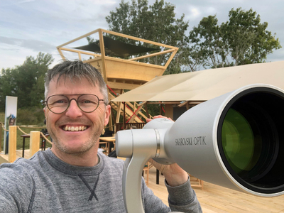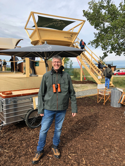 Swarovski Optik had tijdelijk een zeer aangename uitkijktoren gebouwd dicht bij een biologisch station. Daar konden we naar hartelust alle producten bekijken, vergelijken en kregen we ondersteuning van een gans team experten. voor onze vragen.