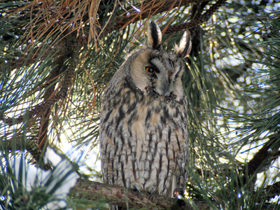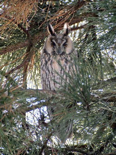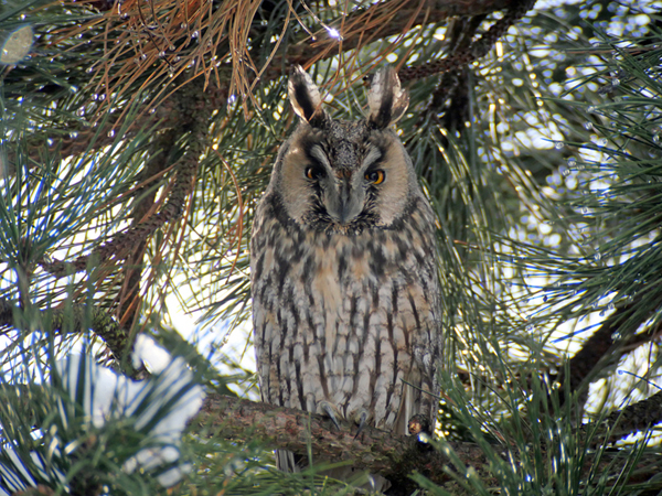 De situatie was verre van ideaal. De ransuilen zaten redelijk hoog in een den én in tegenlicht van de zon. Maar ik had super geluk vandaag ! Er zat ééntje gewoon open en bloot in de top van de boom. Toen ik mijn Swarovski STX85 neerpootte had ik opgemerkt dat de ransuil me in de gaten hield. Rustig aan zette ik de driepoot open en richtte ik de telescoop naar de vogel toe. Een blik door de telescoop was adembenemend ! Door het tegenlicht waren zijn 2 oortjes precies kleine lampjes. Zijn grote oranje ogen staarden me aan. Ik weet niet wat er in zijn gedachten omging maar ik was alvast heel blij met deze waarneming.