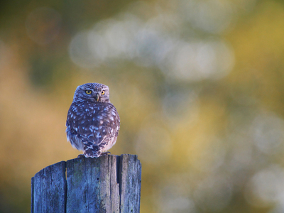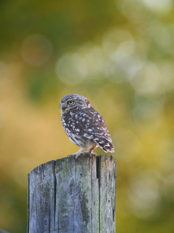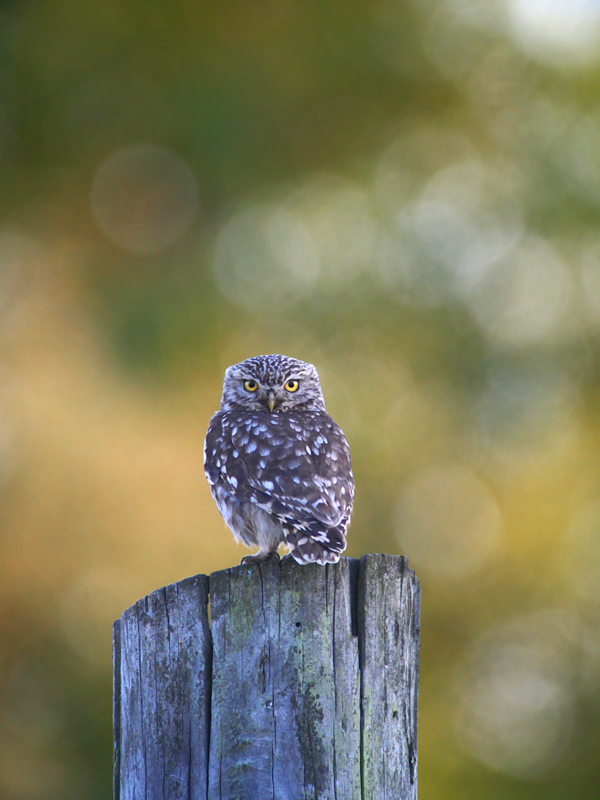 Plots uit het niets, landde de steenuil op het paaltje waar ik mijn Swarovski telescoop op had gericht. De waarneming door de kijker was echt magnifiek! Zijn felgele ogen trokken meteen de aandacht. Ik plaatste het fototoestel achter de lens en drukte een paar keer af.