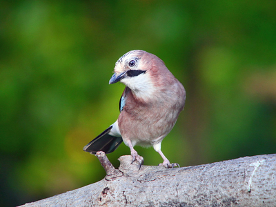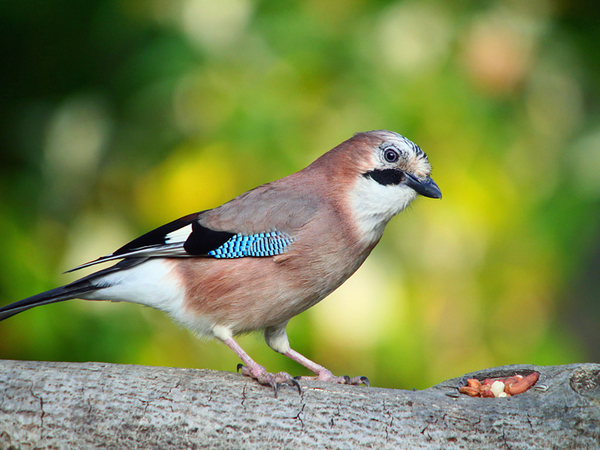 Net voor die plank heb ik een dikke tak van een notelaar horizontaal gemonteerd waarbij ik met een frees een paar gaten en sleuven heb gemaakt waar ik de nootjes wegstop. De gaaien die af en toe in onze tuin vertoeven hadden meteen de noten opgemerkt.