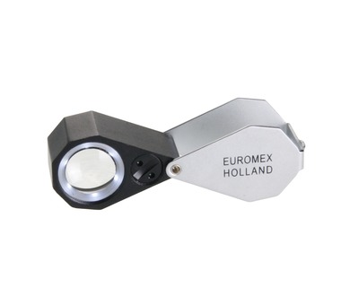Euromex PB 5034 LED verlichting 10x is een professionele inslagloep met zeer hoge kwaliteit zijn gemonteerd in fraai verchroom messing behuizing met ophangoog voor een koord. De lensvatting is verchroomd of zwart gespoten. Met aan/uit knop, witte LED en UV verlichting. Verpakt in lederen etui.